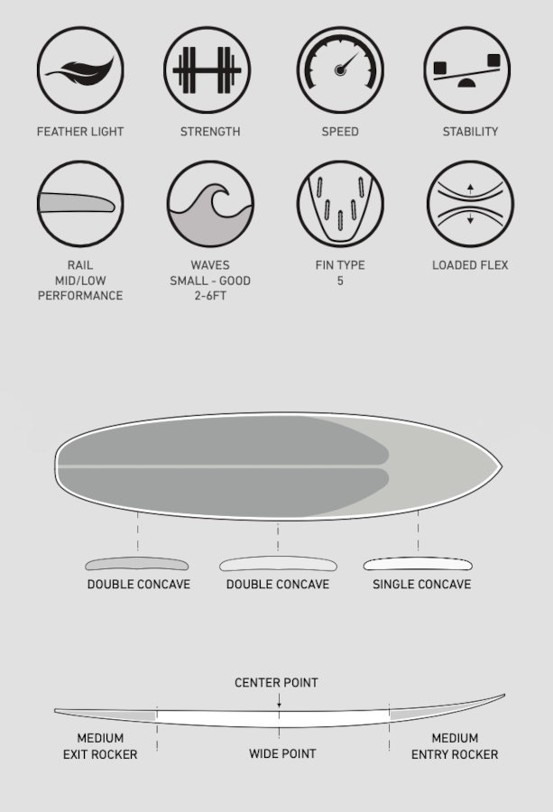 in some bigger surf, as a Twin in small surf, or as a Thruster when you wanna rip. Or ride it with no fins